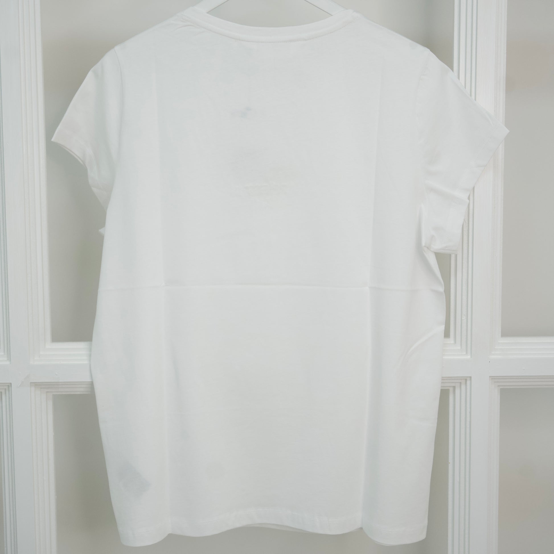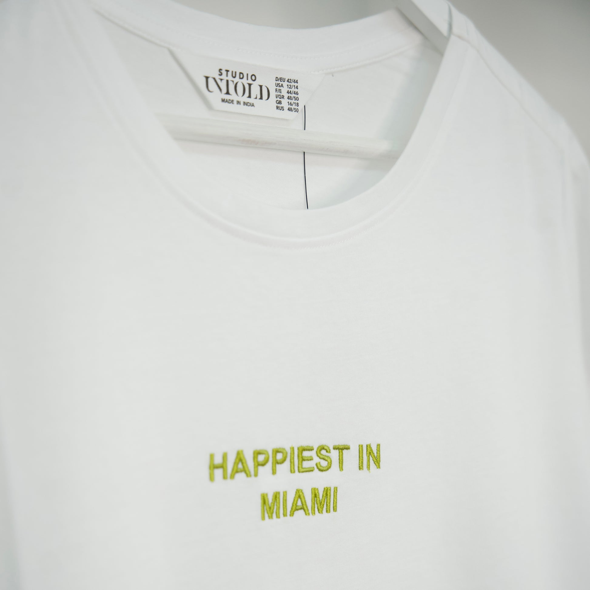 Lässiges weißes T-Shirt mit Rundhalsausschnitt und hochwertiger Stickerei „Happiest in Miami“ in frischem Lime-Grün. Der bequeme Schnitt und das weiche Material machen es zum perfekten Basic für entspannte, sommerliche Looks.