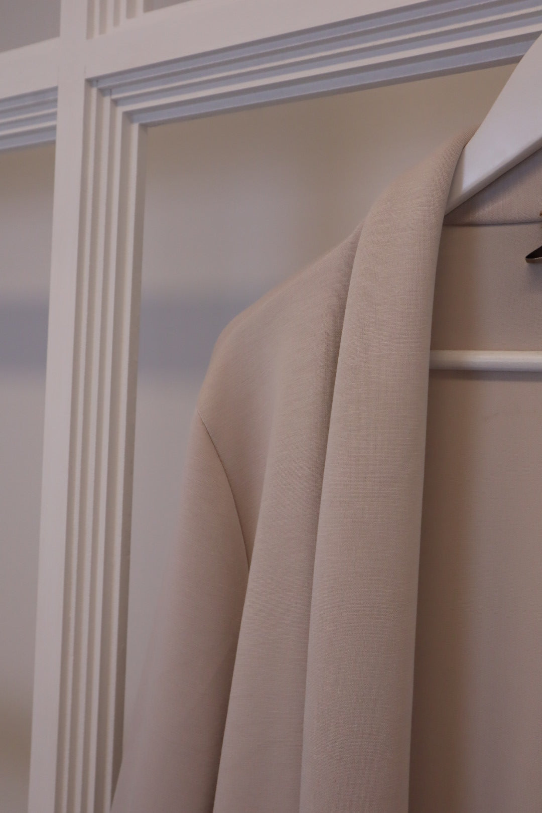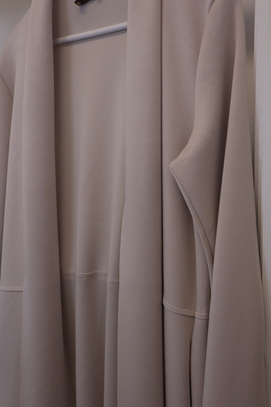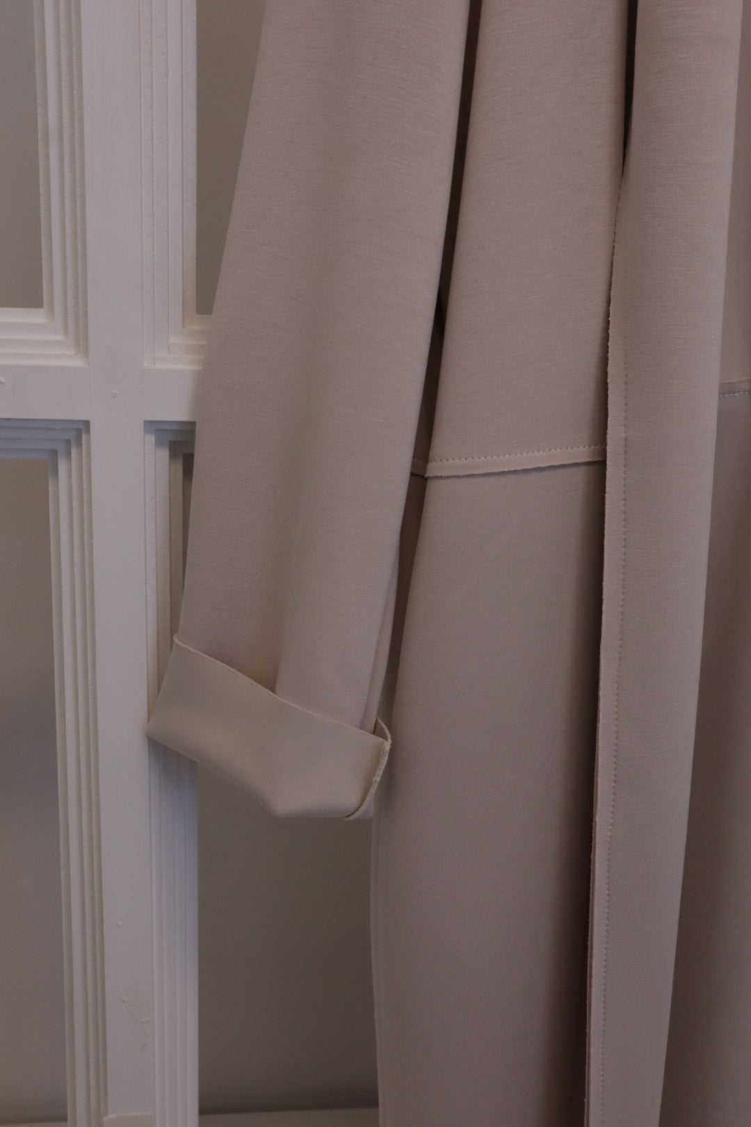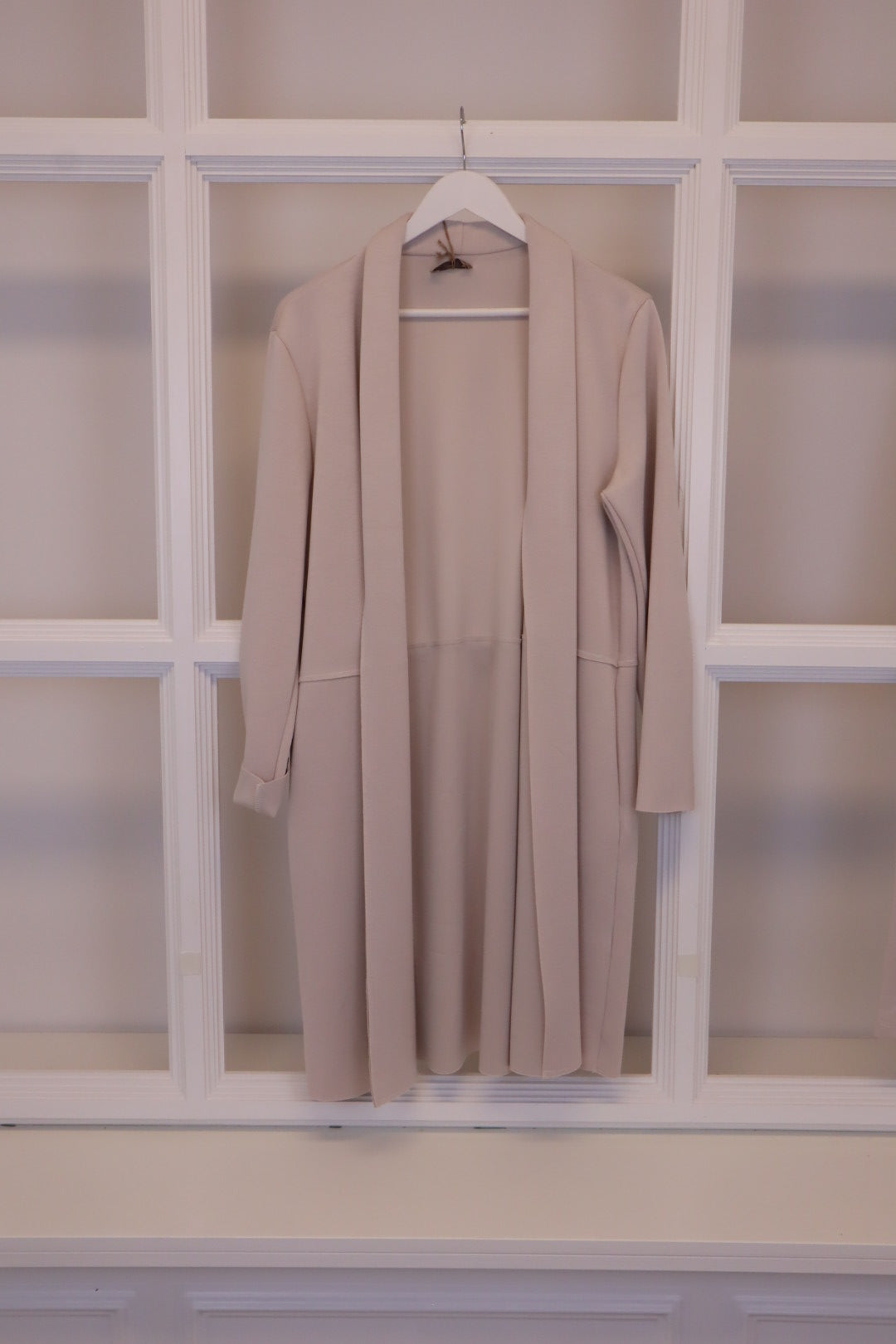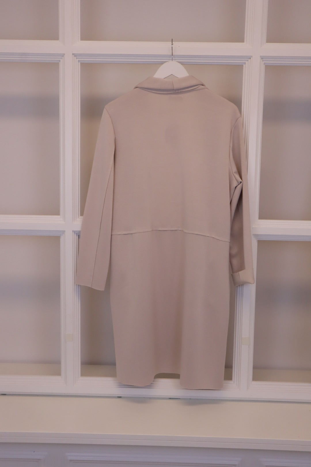 Dieser schöne Stoffmantel in Beige verbindet modernen Komfort mit zeitlosen Stil.