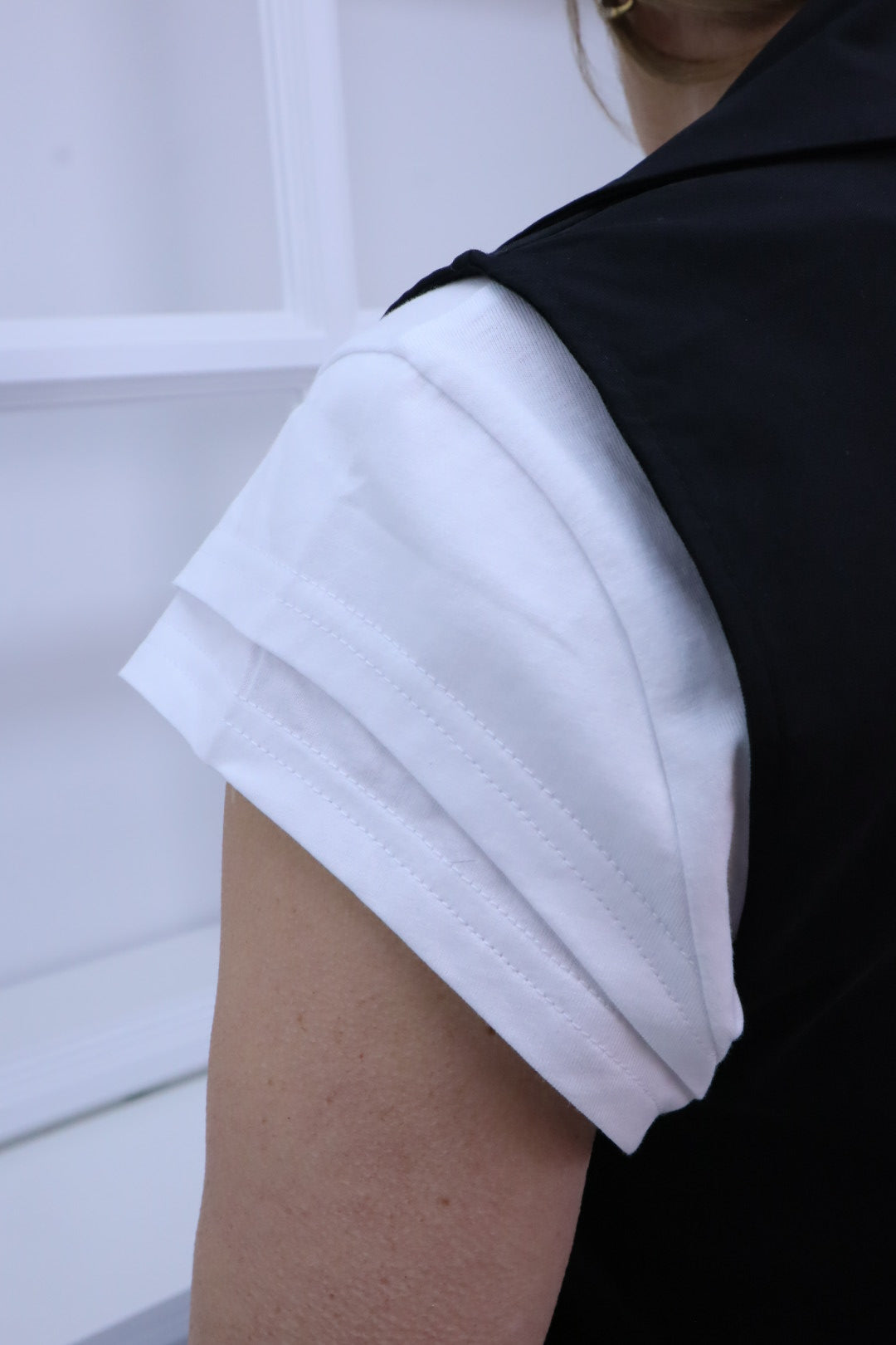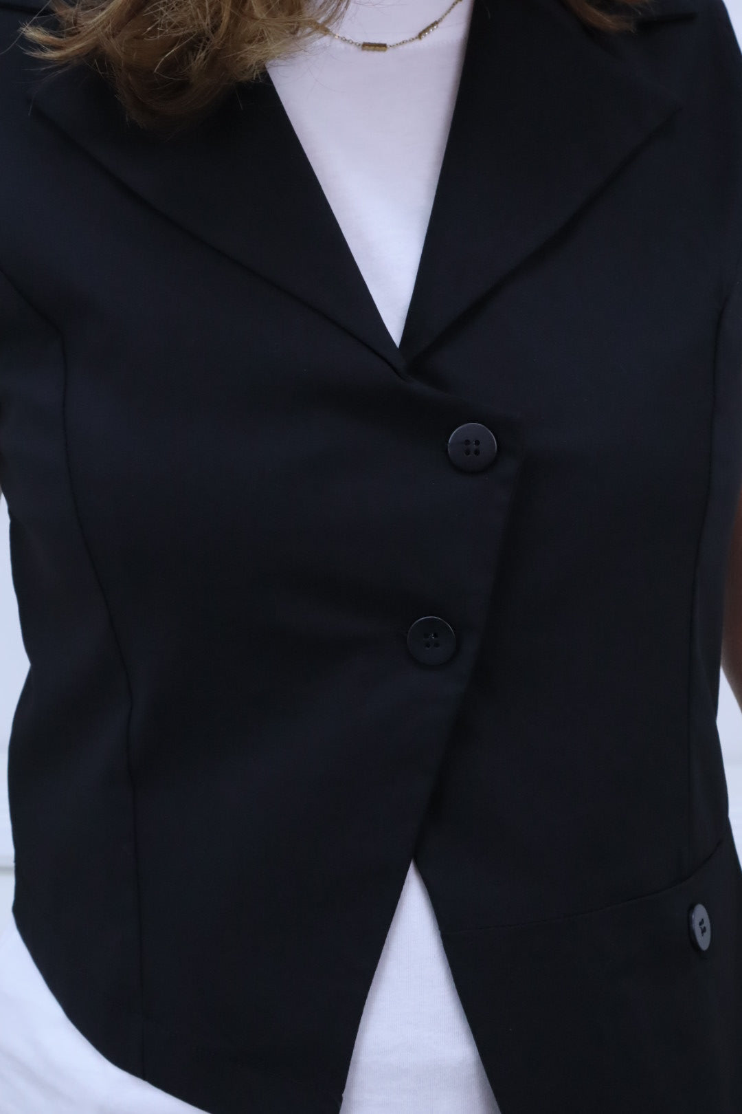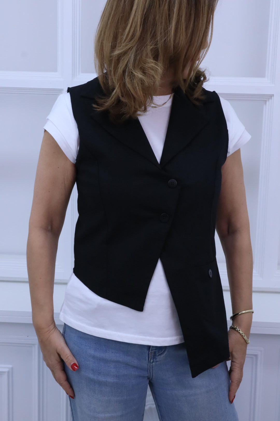 Diese ärmellose Weste besticht durch ihren außergewöhnlichen, asymmetrischen Schnitt und den klassischen Reverskragen.